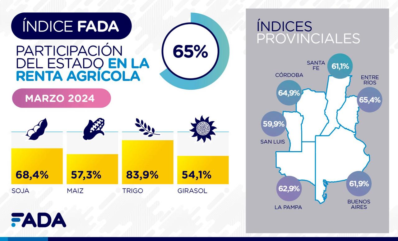 Desagregando el promedio ponderado de cultivos a nivel nacional del 65%, la participación del Estado en soja ocupa el 68,4 por ciento, en maíz 57,3 por ciento, en trigo 83,9 por ciento y en girasol 54,1 por ciento.
