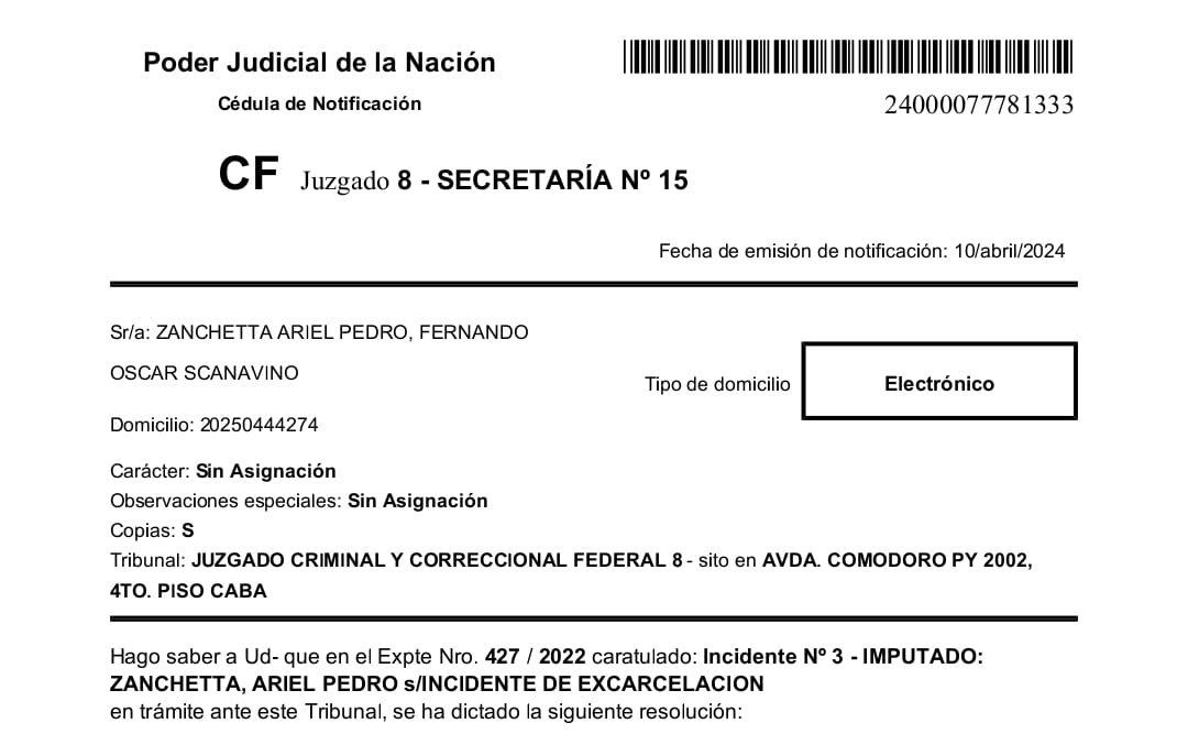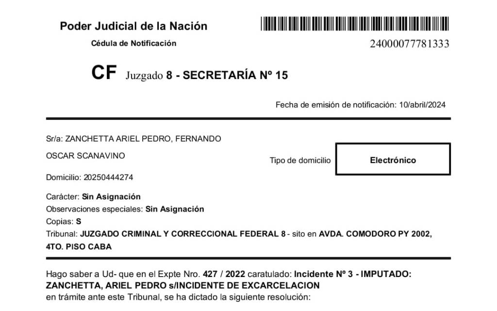 El Juzgado Criminal y Correccional Federal 8 dictaminó la excarcelación del juninense Ariel Pedro Zanchetta, el ex policía acusado de espionaje ilegal a políticos y personas influyentes de la vida pública.