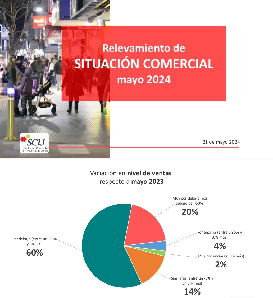 La recesión económica golpea duramente a los comerciantes de Junín. Según una encuesta realizada por la Sociedad de Comercio e Industria de Junín (SCIJ), el 60 por ciento de los comerciantes experimentó una caída en las ventas durante mayo, en comparación con el mismo mes de 2023. La disminución reportada varía entre el 5 y el 50 por ciento.