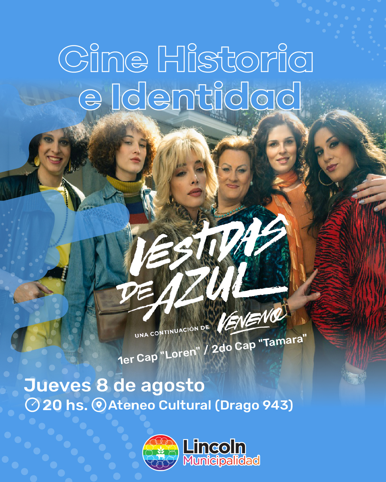La Municipalidad de Lincoln informa que el próximo jueves 8 de agosto, a las 20 horas en el Ateneo Cultural (Drago 943), comenzará a desarrollarse una nueva propuesta de cine-debate en la que se proyectarán los primeros capítulos de la serie “Vestida de azul”, una producción que narra las experiencias de seis mujeres transexuales en la España de principios de los años ’80.