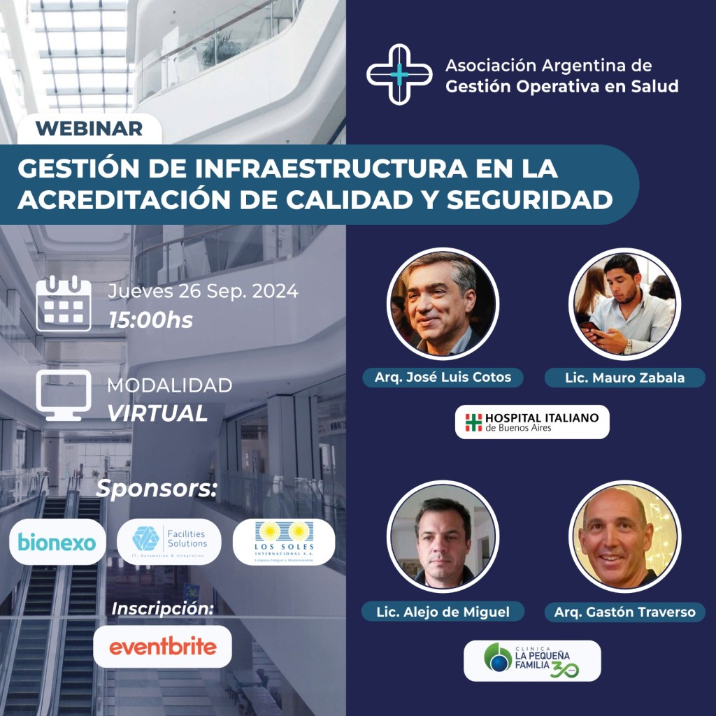 La Asociación Argentina de Gestión Operativa en Salud (AAGOS) invita a participar del webinar “Gestión de Infraestructura en la Acreditación de Calidad y Seguridad”, una exposición de casos reales sobre los desafíos que implican los procesos de acreditación en Salud, que estará a cargo de profesionales del Hospital Italiano de Buenos Aires y de la Clínica La Pequeña Familia de Junín, provincia de Buenos Aires.
