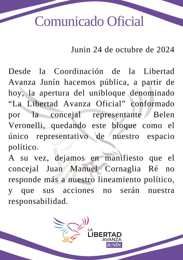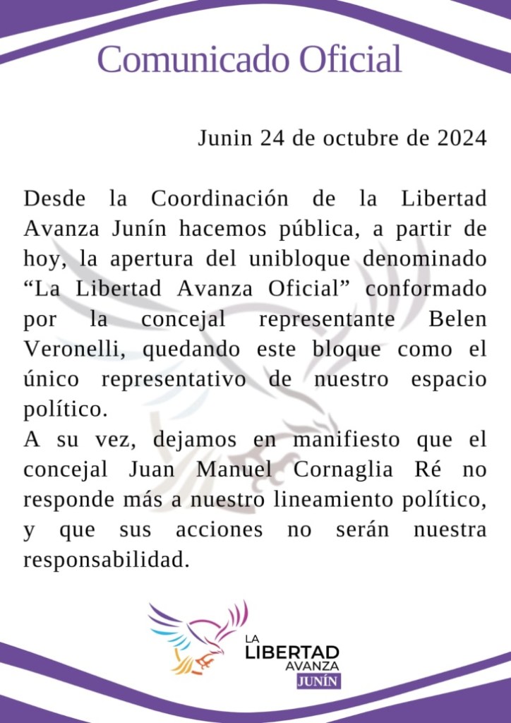 Queremos también informar que el concejal Juan Manuel Cornaglia Re ya no responde a nuestro lineamiento político, por lo que sus acciones no serán responsabilidad de La Libertad Avanza Junín.