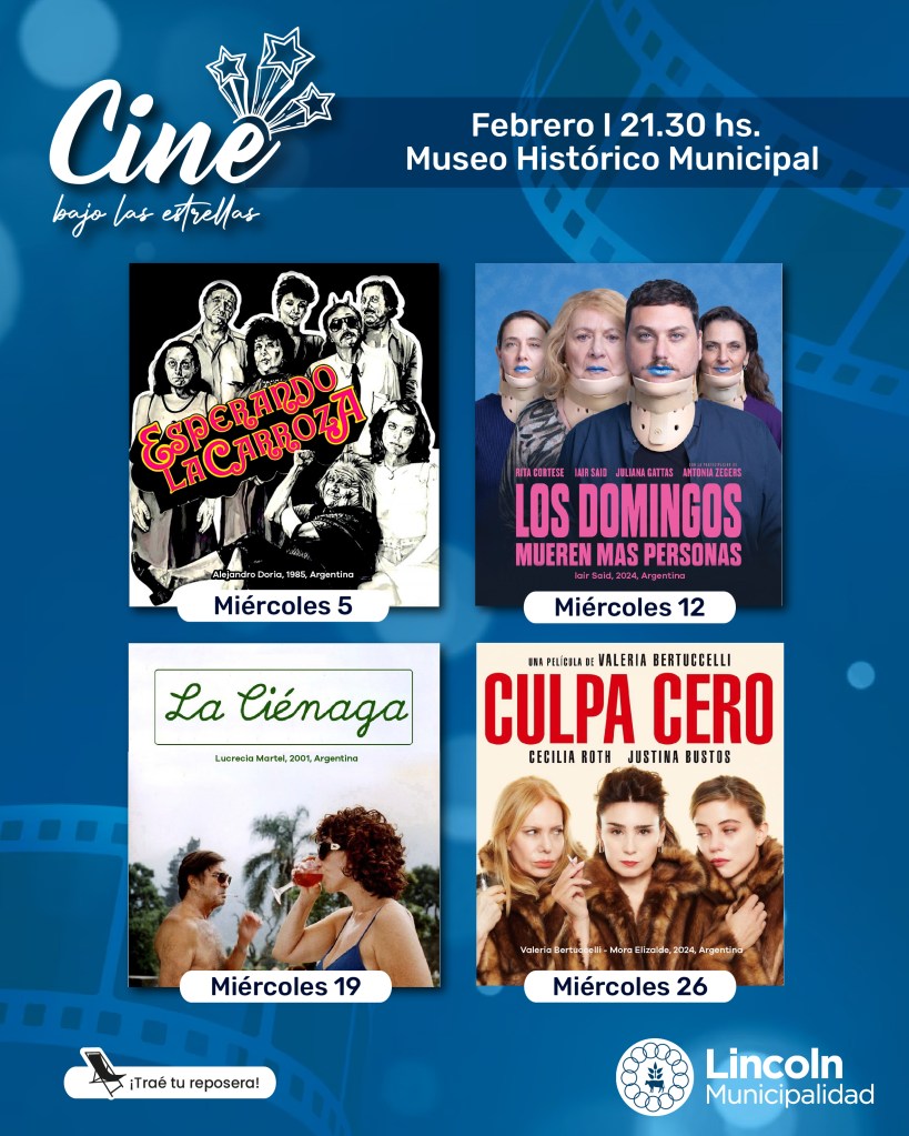 La Municipalidad de Lincoln continúa con la exitosa propuesta cultural “Cine bajo las estrellas” durante todo febrero, ofreciendo proyecciones gratuitas de grandes películas nacionales al aire libre. La cita es cada miércoles, a las 21:30 horas, en la explanada del Museo Histórico Municipal del Parque General San Martín.