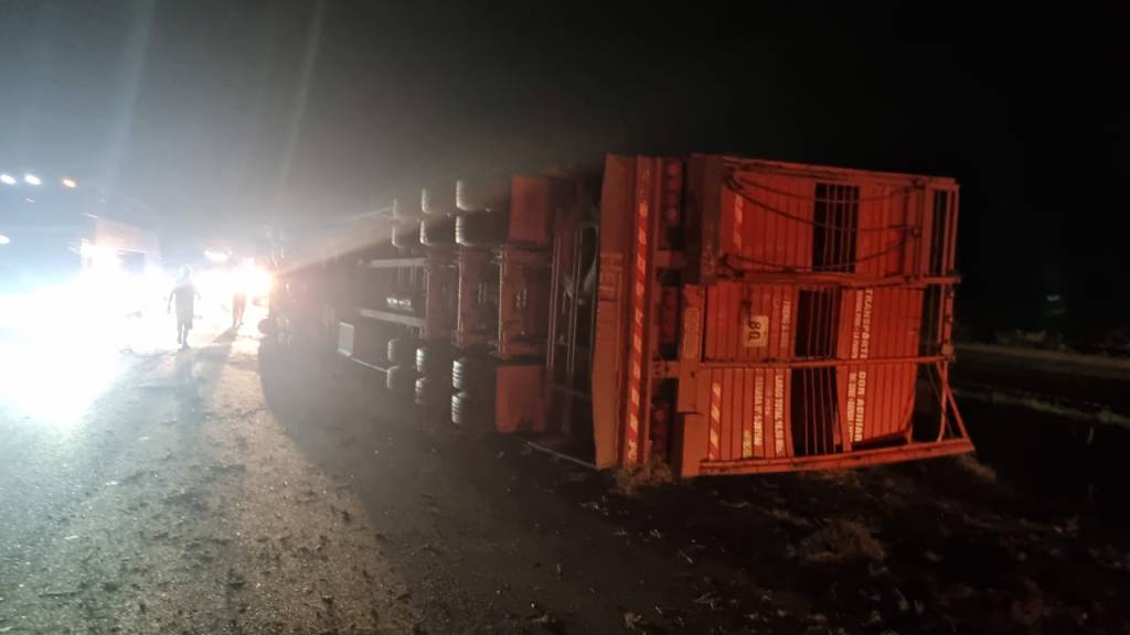 Un camión Scania modelo G410, patente OVJ 646, volcó en la autopista 7, a la altura de la localidad de Heavy, mientras transportaba ganado vacuno en pie.