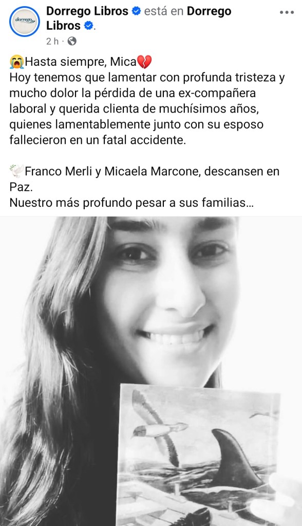 Desde la librería juninense Dorrego Libros expresaron en redes sociales: «Hasta siempre, Mica. Hoy tenemos que lamentar con profunda tristeza y mucho dolor la pérdida de una ex-compañera laboral y querida clienta de muchísimos años, quienes lamentablemente junto con su esposo fallecieron en un fatal accidente. Franco Merli y Micaela Marcone, descansen en Paz. Nuestro más profundo pesar a sus familias…».