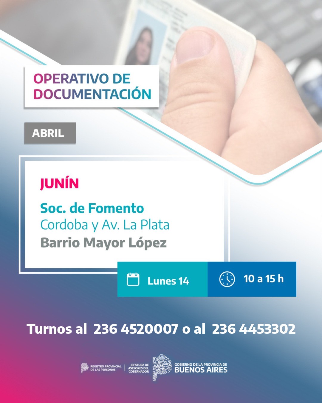 El próximo lunes 14 de abril, la Dirección de Documentación de la Jefatura de Asesores del Gobernador de la provincia de Buenos Aires realizará un nuevo operativo de documentación en Junín. El evento tendrá lugar en la Sociedad de Fomento del barrio Mayor López, ubicada en Córdoba y Avenida La Plata, entre las 10:00 y las 15:00 horas.