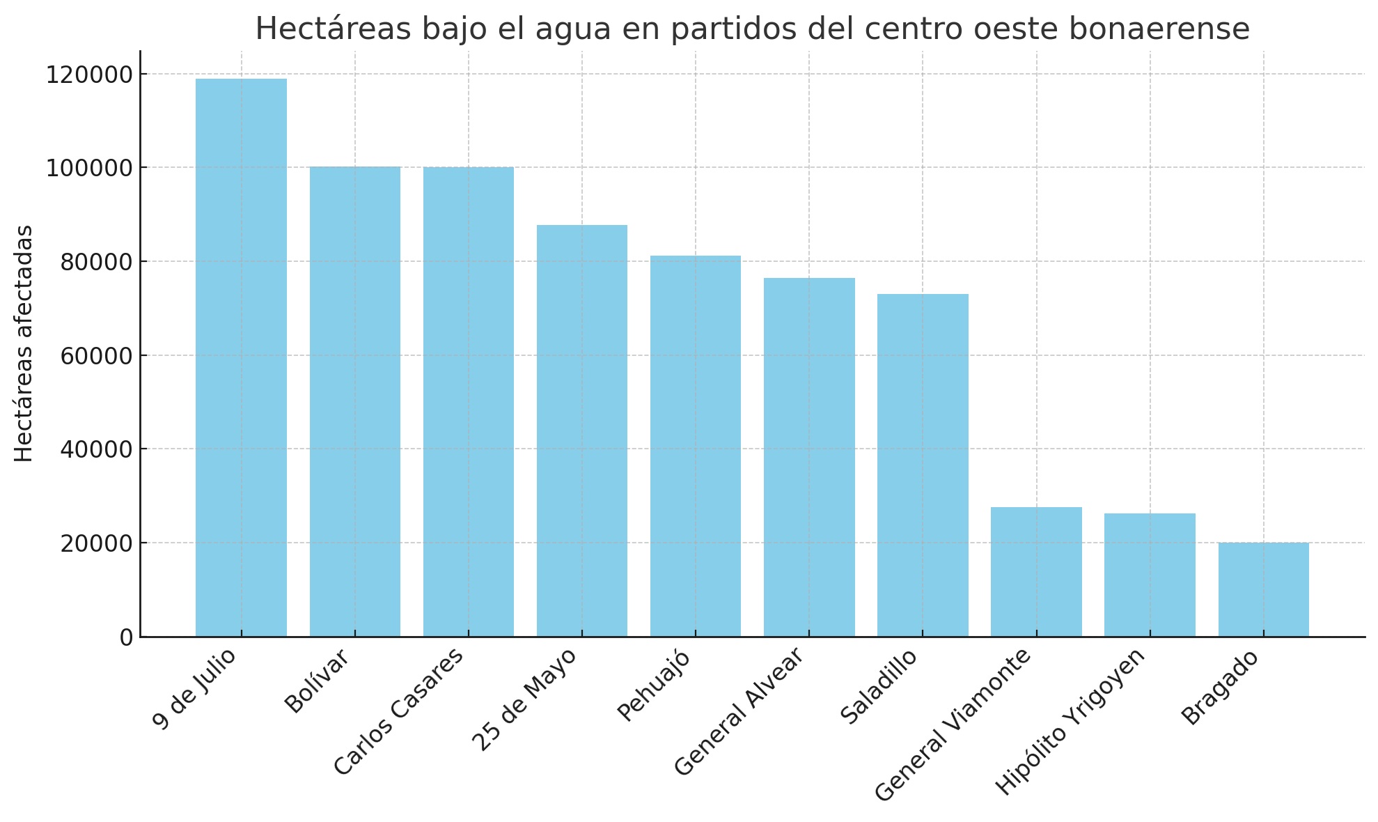 El informe, realizado mediante imágenes satelitales entre el 7 y el 10 de agosto, detalla que el partido más afectado es 9 de Julio, con 118.929 hectáreas inundadas o anegadas, seguido por Bolívar (100.123) y Carlos Casares (100.057). Otros distritos comprometidos incluyen 25 de Mayo, Pehuajó, General Alvear, Saladillo, General Viamonte, Hipólito Yrigoyen y Bragado.