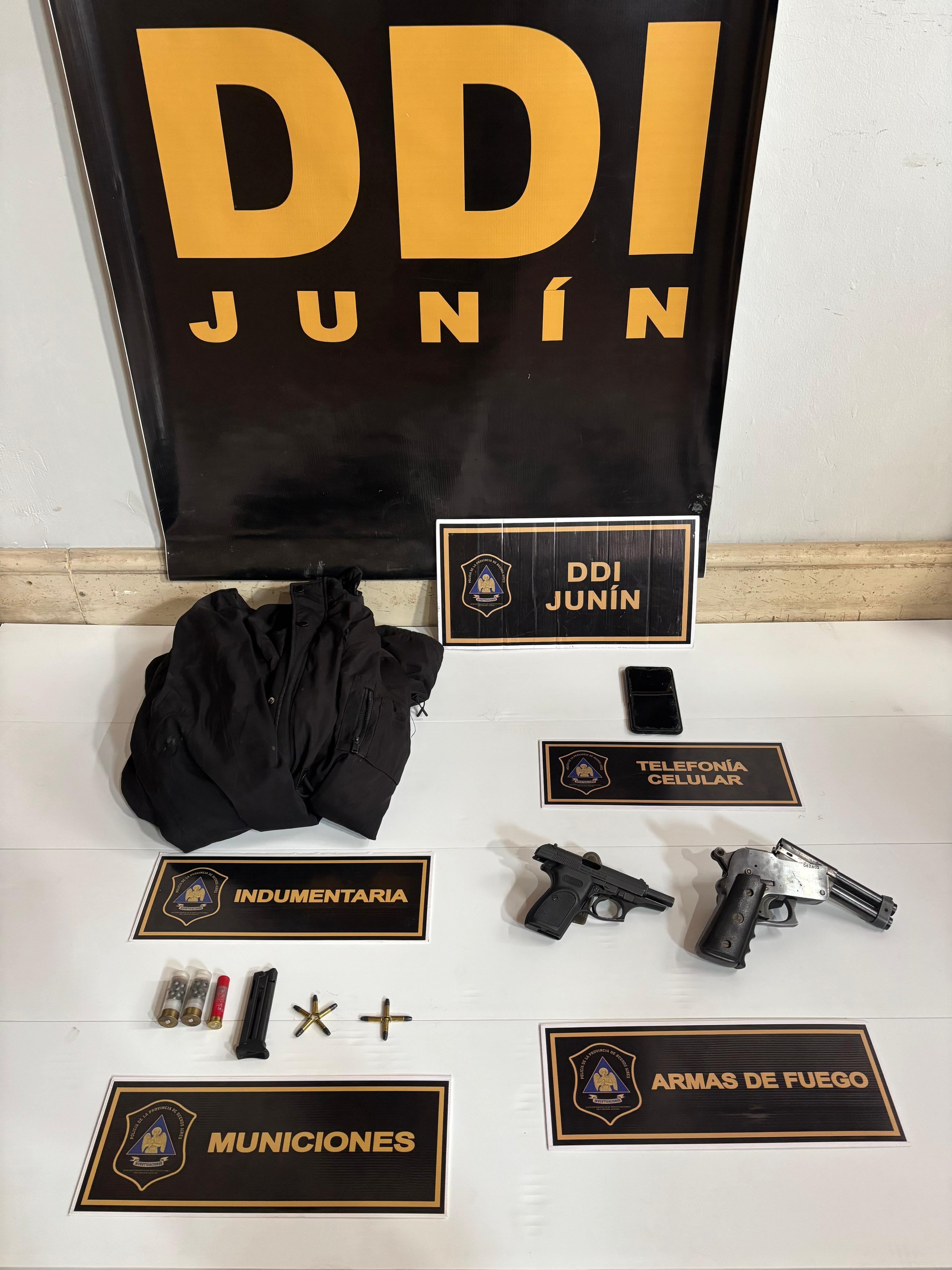 Tras reunir las pruebas, la Fiscalía ordenó dos allanamientos en domicilios de Junín. Como resultado, se aprehendió al sospechoso, un hombre de 21 años, y se secuestraron los siguientes elementos vinculados al hecho: