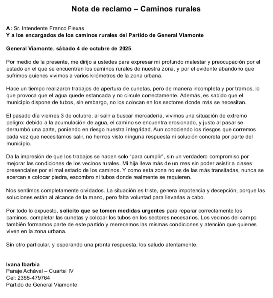 Vecinos de Paraje Achaval, en el Cuartel IV del partido de General Viamonte, denuncian el mal estado de los caminos rurales que utilizan diariamente, señalando riesgos para su seguridad y dificultades para acceder a servicios básicos.