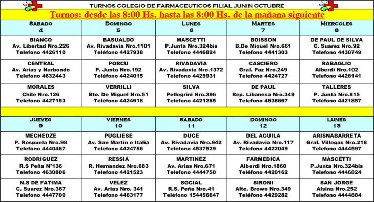 Los turnos son desde las 8:00 hasta las 8:00 del día siguiente y se actualizan semanalmente en el sitio del Colegio de Farmacéuticos de Junín.
