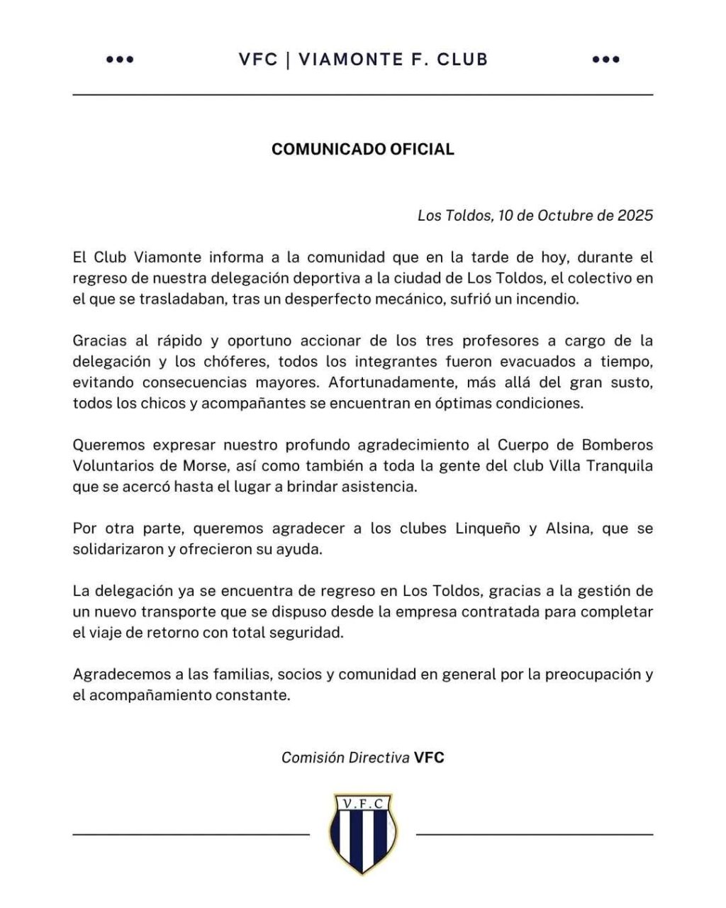 El Club Viamonte de Los Toldos emitió un comunicado oficial este viernes luego del incendio que afectó al colectivo en el que regresaba su delegación deportiva desde Morse.