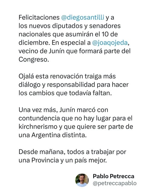 En una publicación en sus redes sociales, el jefe comunal felicitó a Diego Santilli y a los nuevos diputados y senadores nacionales que asumirán el 10 de diciembre, entre ellos a Joaquín Ojeda, vecino de Junín que integrará el Congreso.