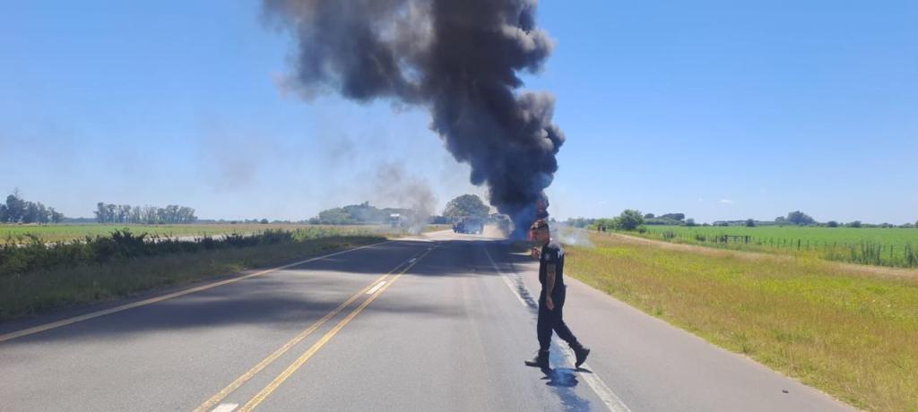 El vehículo pertenecía a la empresa Transporte Oeste y circulaba vacío al momento del siniestro. En el lugar trabajaron el Sargento Godoy (móvil RO 30607) y el Teniente Radeto (móvil RO 19256) del cuerpo de Bomberos, junto con personal del Peaje RN7 a cargo de Alfredo Grisorio. Se realizó tránsito asistido mientras se controlaban las llamas y se aseguraba la zona.
